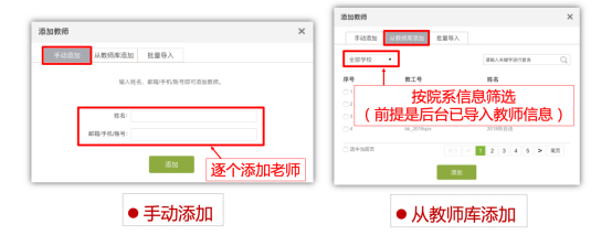 点击添加教师之后,可以通过“手动添加”和“从教师库添加”两种方式来添加。