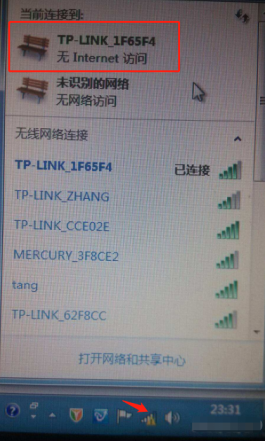 b) 无线网图标出现黄色叹号,并且可看到提示无Internet访问,无线路由器配置丢失,请参考无线路由器配置手册,重新配置IP地址等信息。