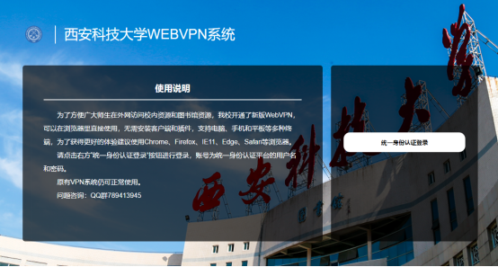 校外访问地址:http://webvpn.xust.seone.net(为了获得更好的体验建议使用Chrome、Firefox、IE11、Safari等浏览器)。