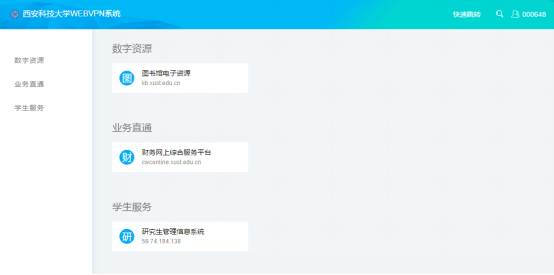 如需访问校内其他内网资源服务,可通过“快速跳转”按钮输入相关地址进行访问。